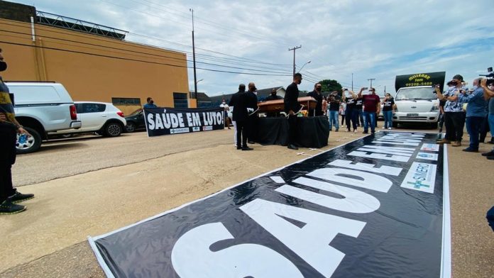 Profissionais da saúde fizeram nesta sexta-feira (4), um velório simbólico durante protesto denunciando as condições de trabalho da categoria na pandemia da Covid-19.